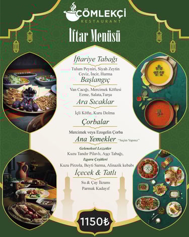 Toplu yemek organizasyonlarınız için ideal bir mekan arıyorsanız, Çömlekçi Restaurant tam size göre! Özel günler, iş yemekleri ve grup organizasyonlarınız için kişiye özel menüler ve fiyat teklifleri sunarak misafirlerinize en iyi hizmeti vermeye hazırız. Geniş alanlarımız ve profesyonel ekibimizle, organizasyonlarınızı unutulmaz kılıyoruz.
